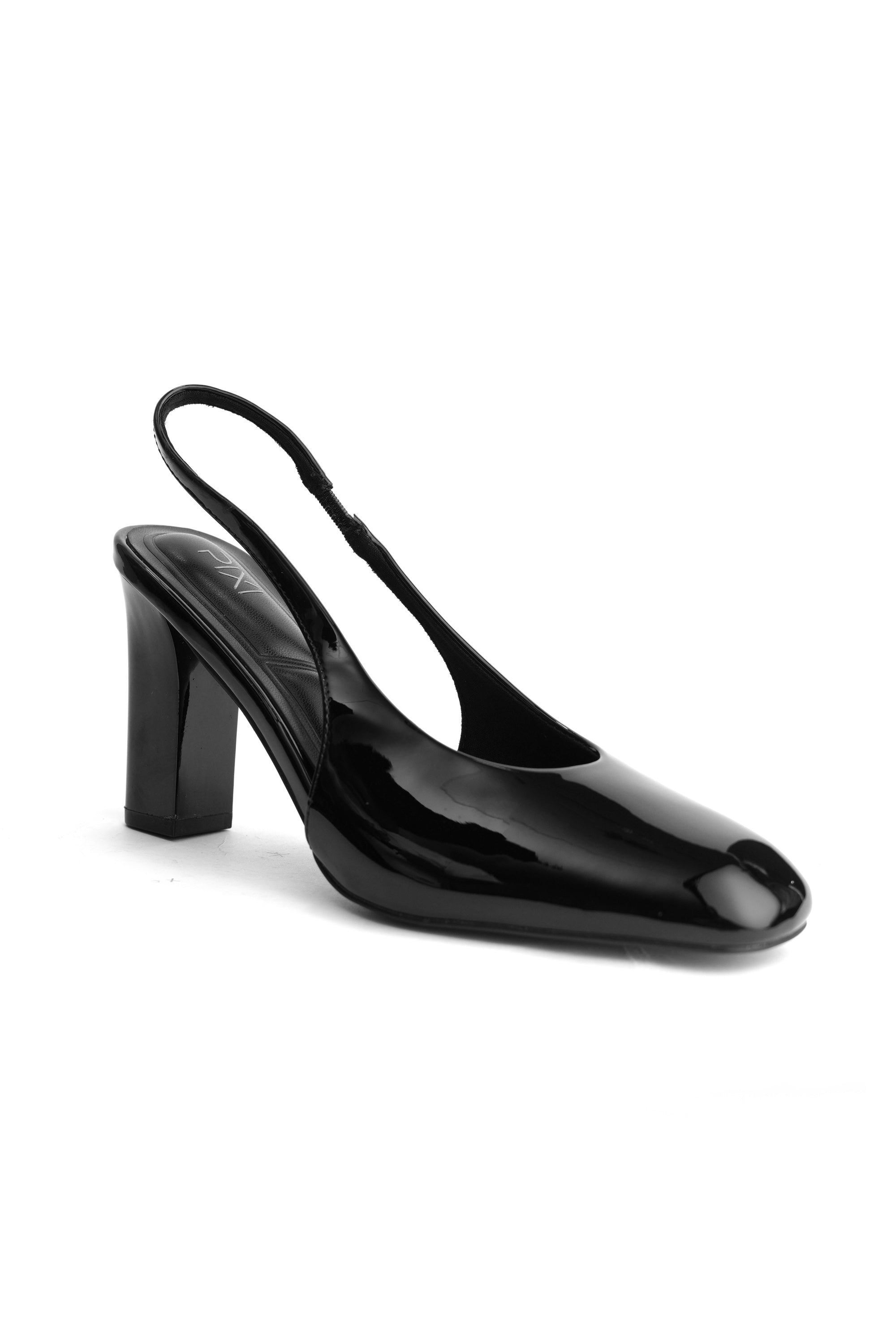 Code No.:01-5508 High Chunky Block Heel Close Square Toe Slingback Pumps Easy Slip-on , Glossy Leather , Heel measures around cm