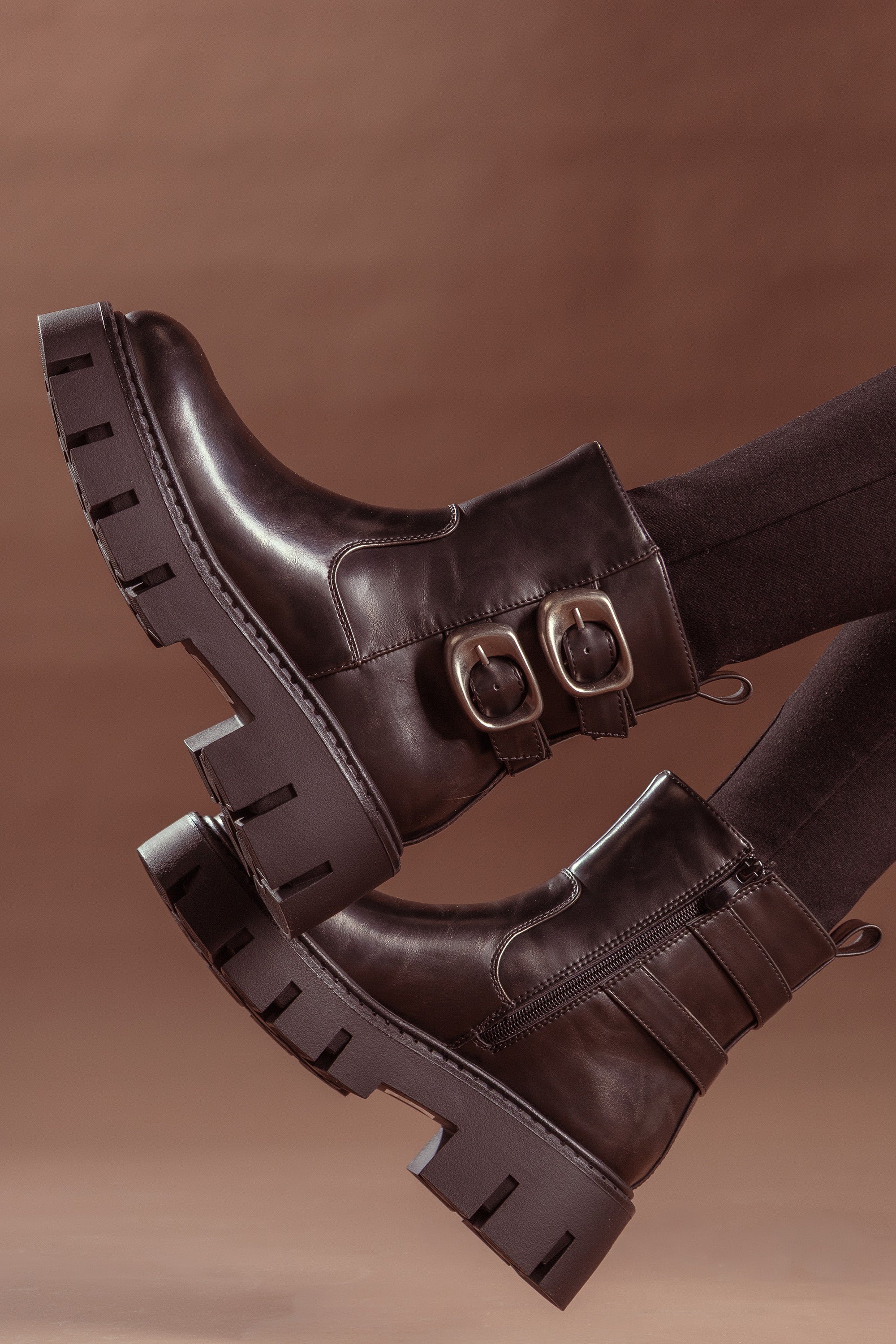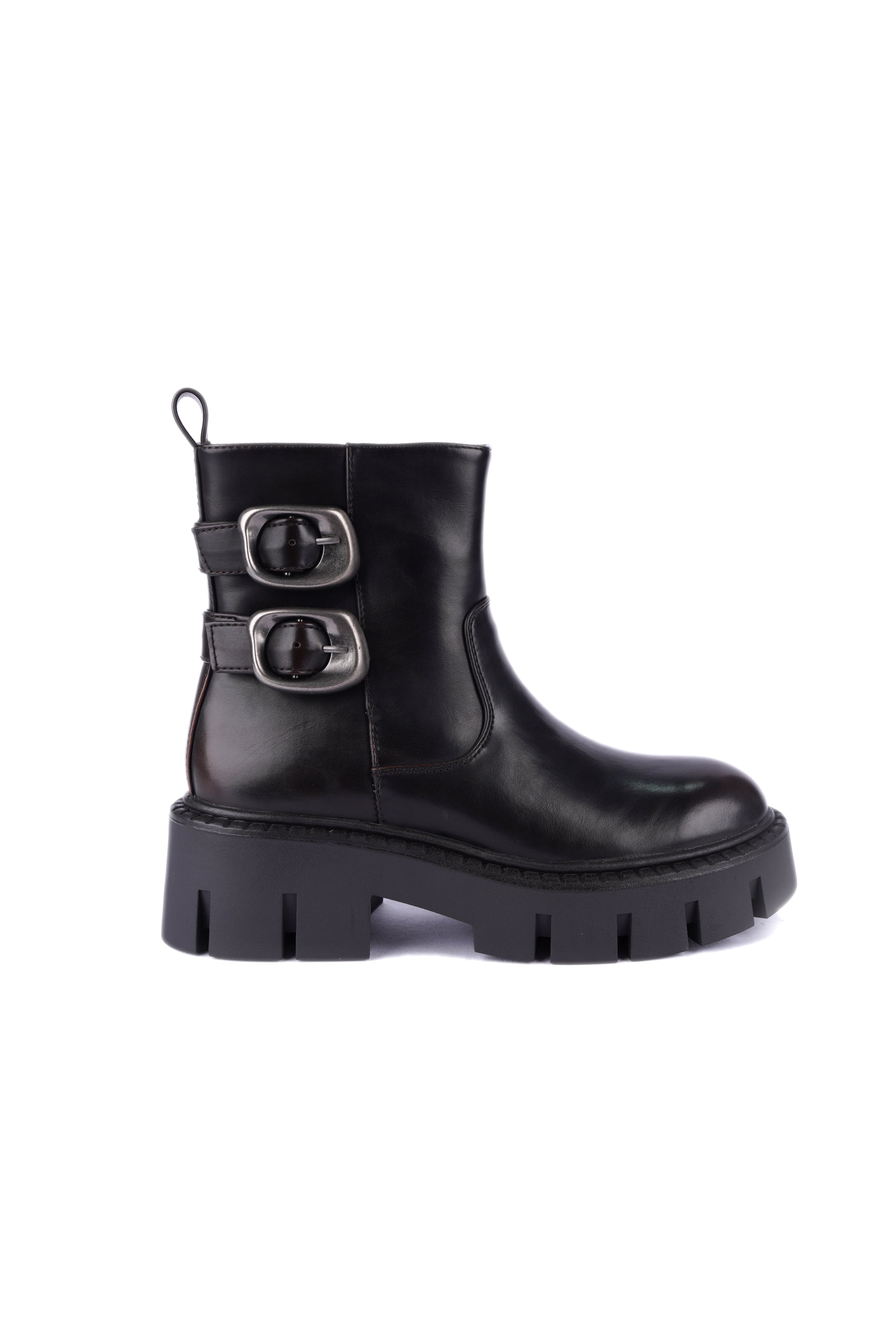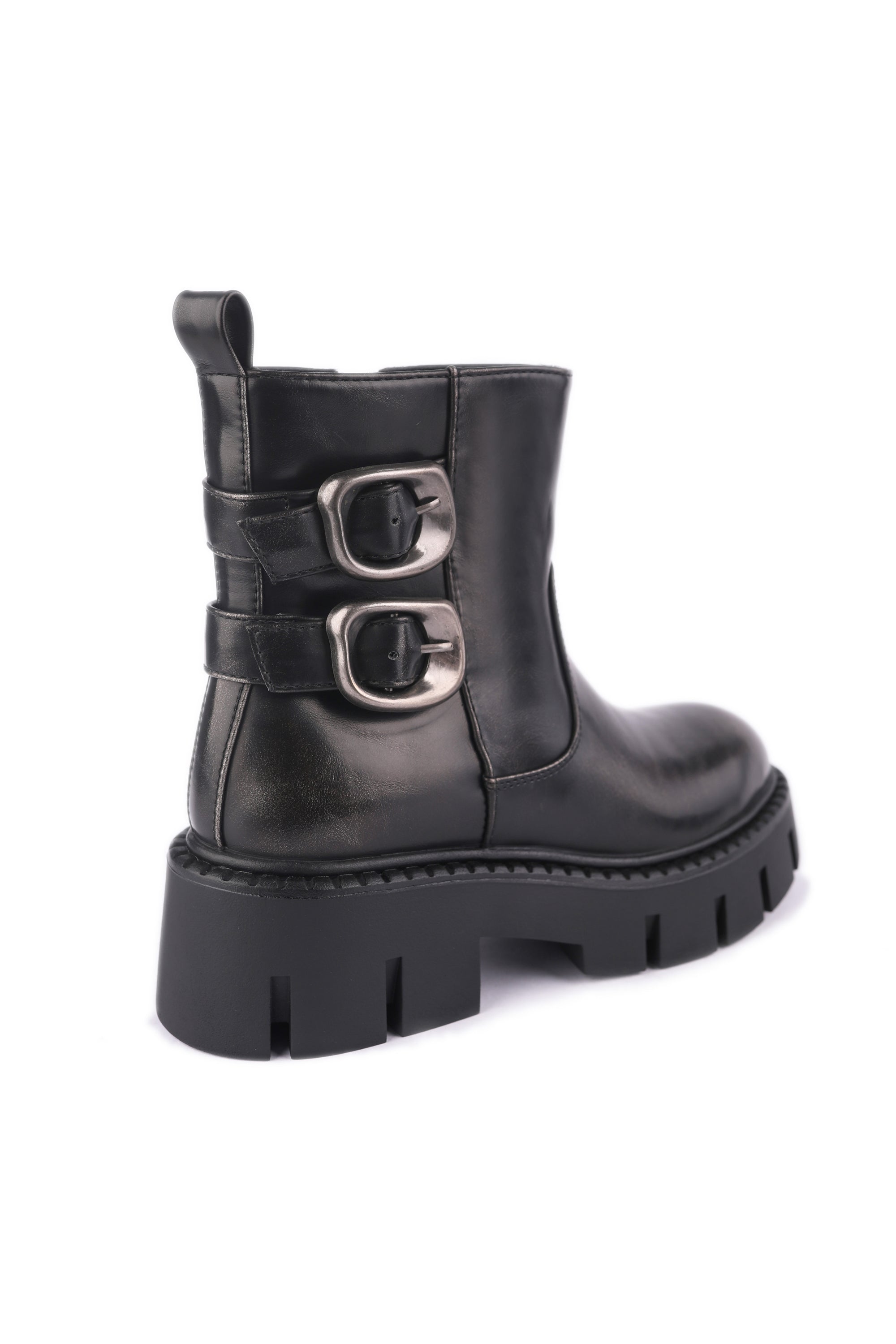 Code No.:01-5562 Leather half boot , Adjustable flap with buckle clasp and zip side closure , round toe , chunky Block heel measures around cm