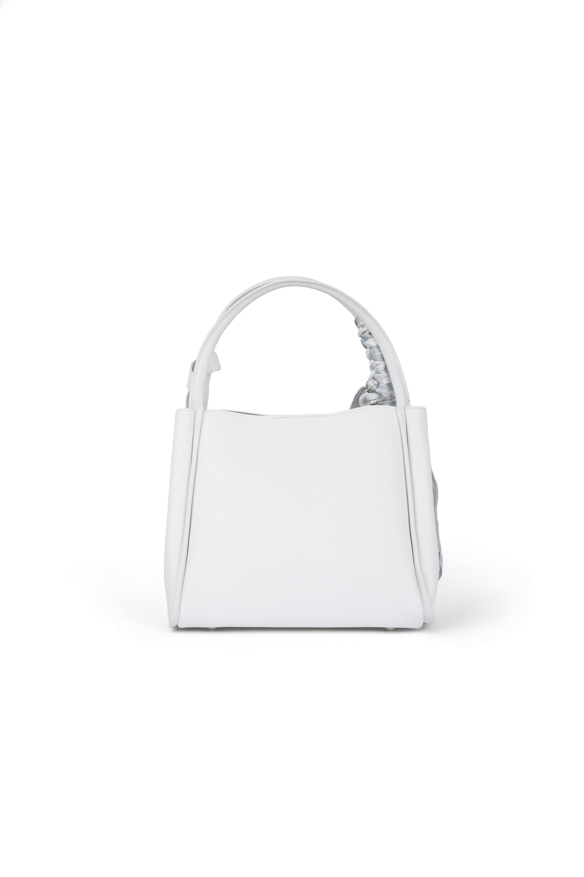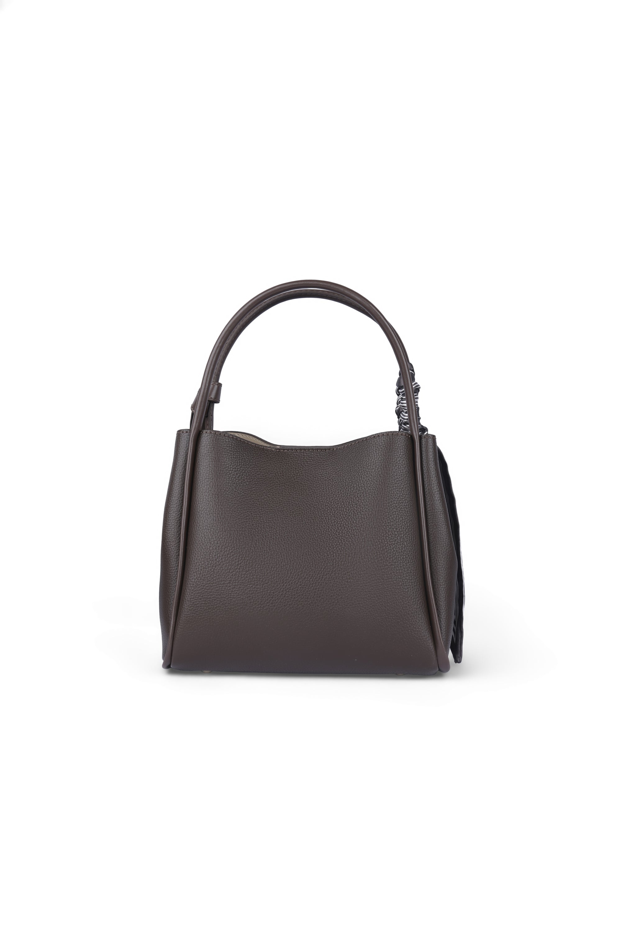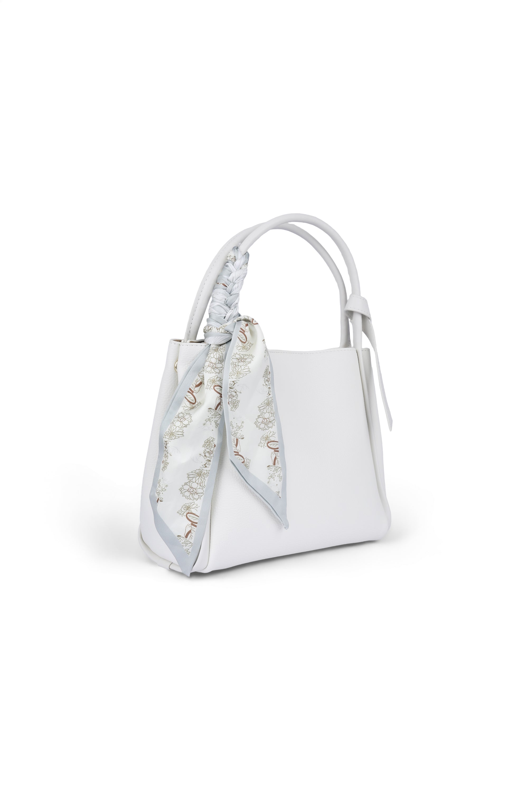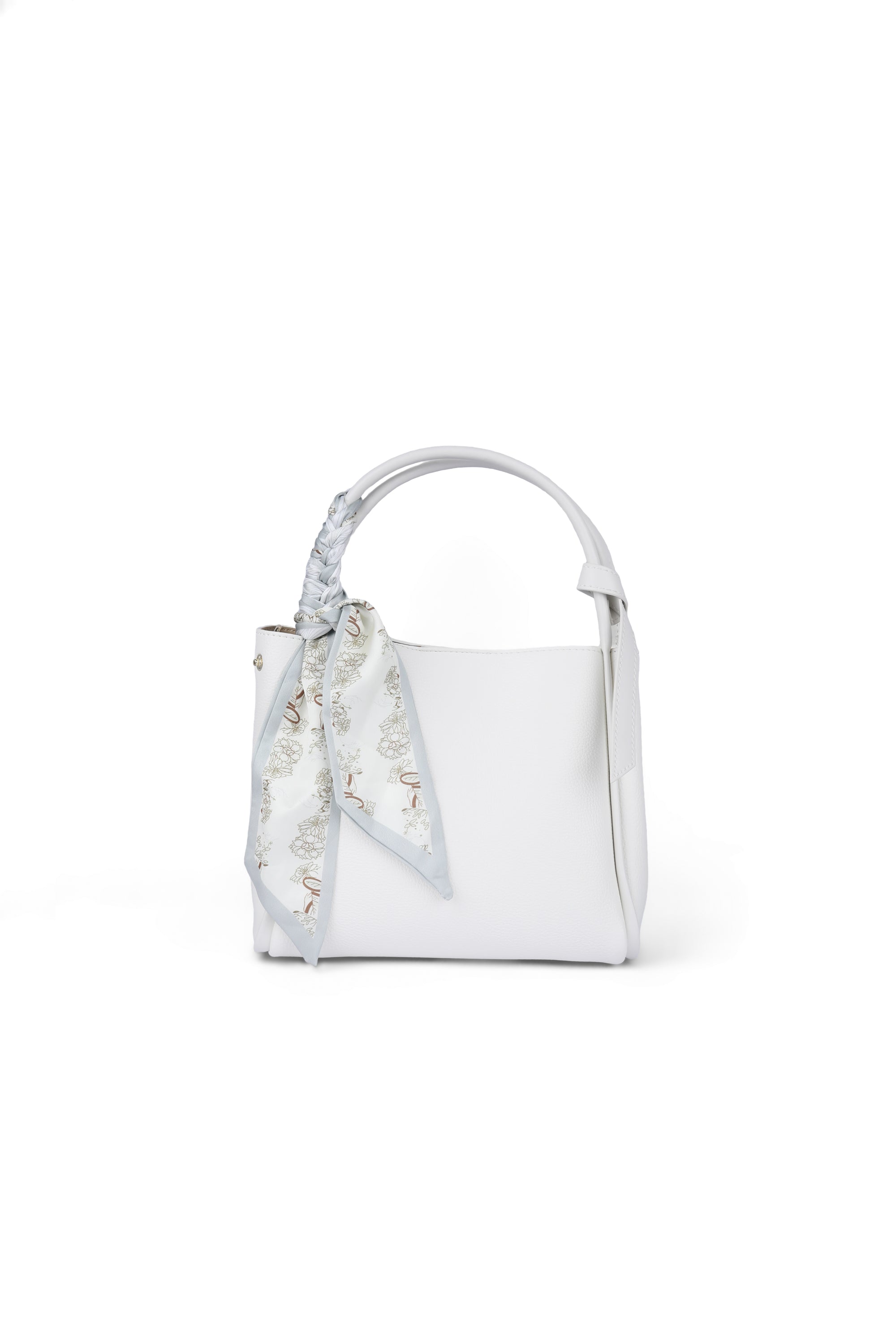 Code No.:025628 Hand Bag medium sized made of leather ,Zip Closure ,with side silk scarf on top handle, adds movement to your style with its elegant scarf detail, Dimensions 21*10*19.5